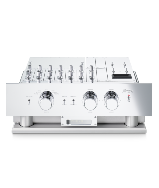 When fully equipped, the top of the preamp shows an impressive array of up to 20 special potentiometers and a number of toggle switches on top of chromed and engraved cover plates. This points out the sheer unlimited usability of the 808 as a control center for an audio system, whether at home or in a professional setting. Three large rotary dials for input selection and volume settings dominate the high-gloss chrome front. These stepped attenuators dial into every setting with a positive and pleasing click. With its latest-generation external power supply the 808 MK5 cements its status as an international icon in high-end audio.