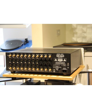Tube hours can be monitored, there is a Processor pass-through for home theater applications, and the display is dimmable with the option of being turned off. All of the inputs and outputs have balanced XLR and single-ended RCA connectors, including six pairs of discrete inputs, a processor (unity gain) input, a monitor loop, and two sets of main outputs. A new microprocessor controls all functions. The rear panel also includes a 12V trigger and a 15A IEC connector.